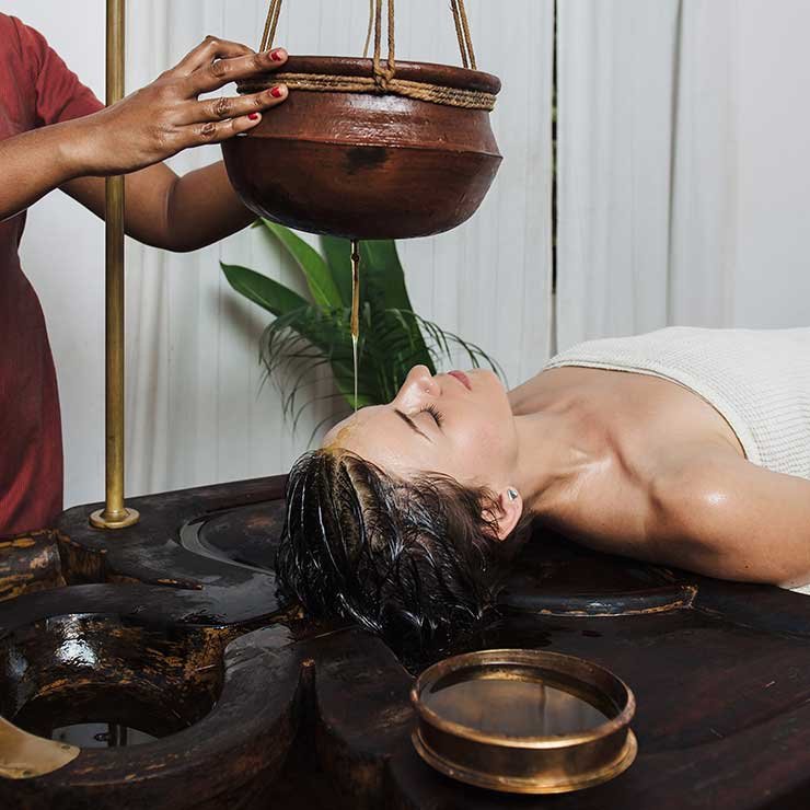 A calming treatment where warm herbal oil is poured gently onto the forehead